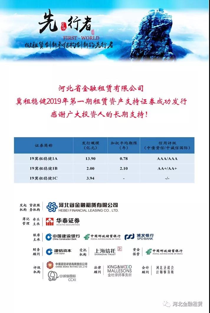 日前,河北省金融租賃有限公司(以下簡稱“河北金租”)冀租穩(wěn)健2019年第一期租賃資產(chǎn)支持證券在銀行間債券市場成功簿記建檔發(fā)行,合計(jì)金額19.84億元。
